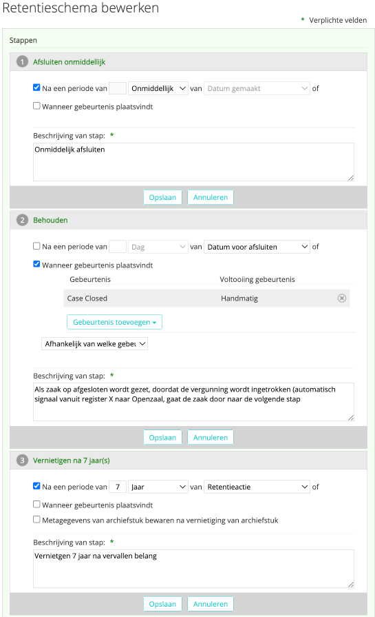 Als voorbeeld 'Afleidingswijze brondatum: Hoofdzaak'. Als de hoofdzaak een einddatum krijgt, wat gebeurt er dan in Open Zaak met de 'sub zaak' (die al is afgehandeld). Krijgt deze in Open Zaak een update met een datum, is dat archiefactiedatum? Zo ja, dan kunnen we met de callback deze trigger implementeren. Zo nee, hoe moeten wij dit dan oplossen? Voor 'Afleidingswijze brondatum: Eigenschap' zou dit gewoon de trigger kunnen zijn bij afsluiten zaak. Maar nu kunnen we ook zaken afsluiten ook al zijn de eigenschappen niet ingevuld.