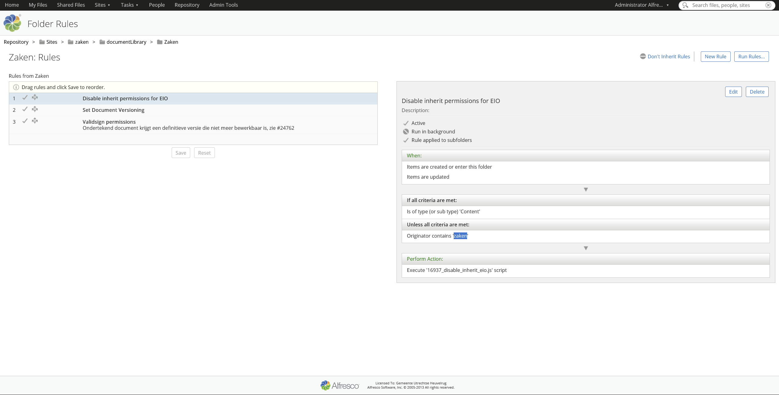 * Rule is applicable for all cm:content types and need to be configured for create and update triggers. Rule need to be created on the 'Zaken' folder.