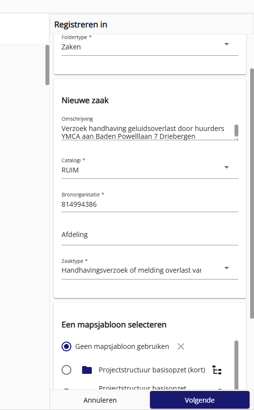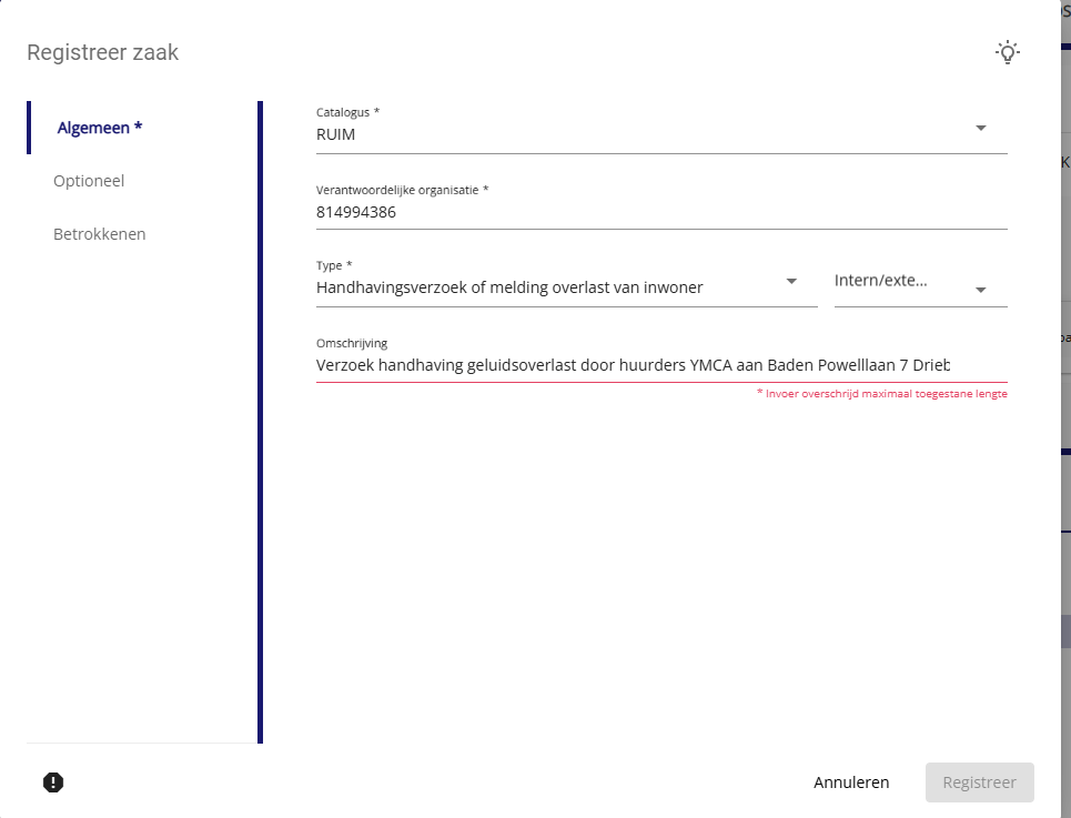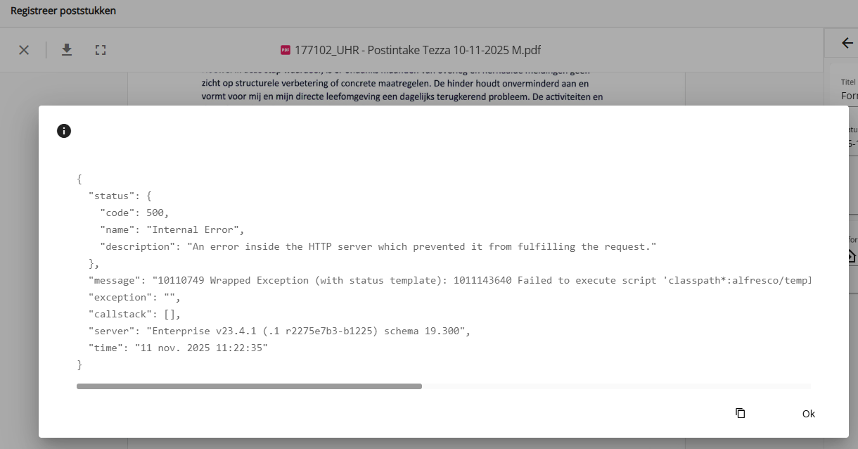 Desbetreffende foutmelding die je pas op het einde krijgt bij het aanmaken van een zaak via de postintake: