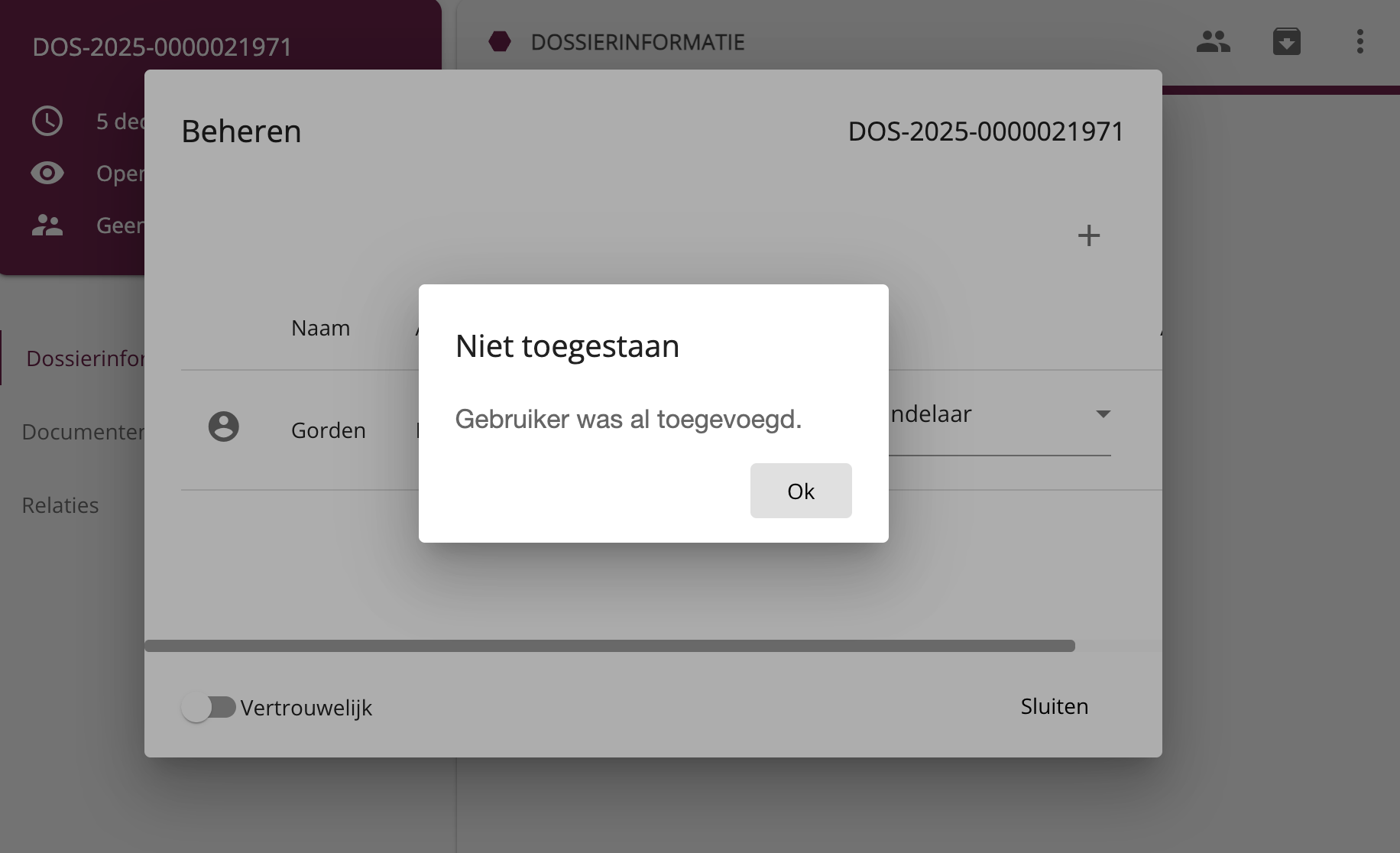 De dialog wordt gebruikt voor:- een waarschuwing dat er geen dubbele gebruiker als behandelaar van een dossier of object. Dit kan vervangen worden door een snackbar melding.