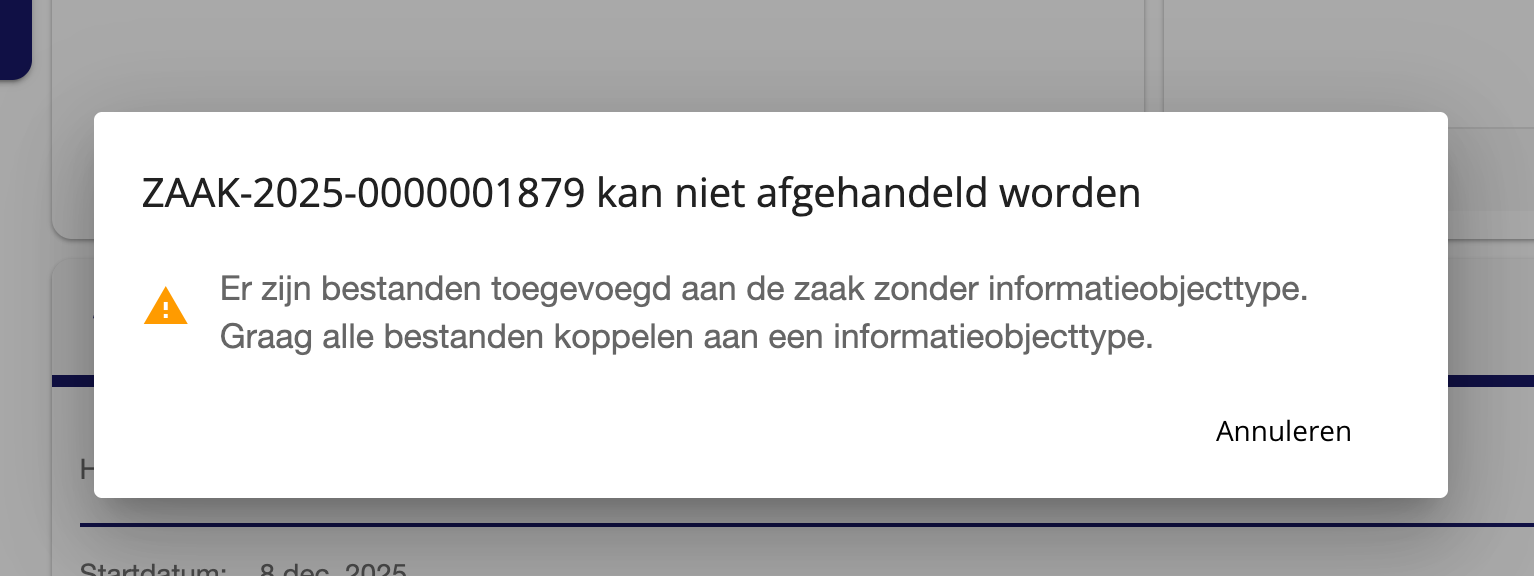 - waarschuwing bij het sluiten van een zaak met vergrendelde documenten of documenten zonder informatieobjecttype.