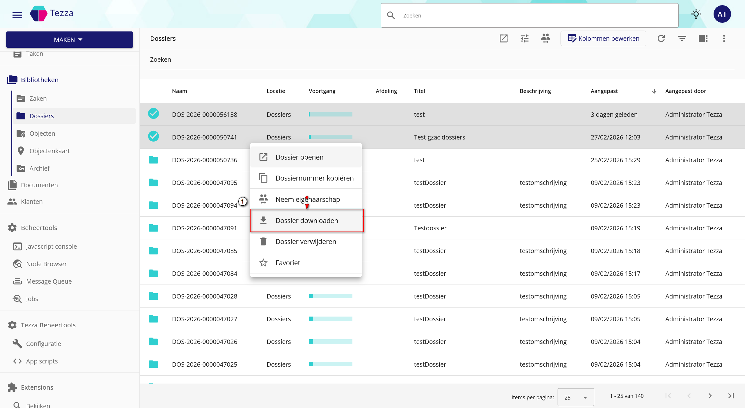 Zoals je op Dossier met CTRL ingedrukt houden multi-select kunt triggeren en Dossiers kunt Downloaden, zie screenshot: